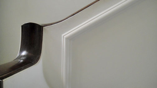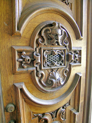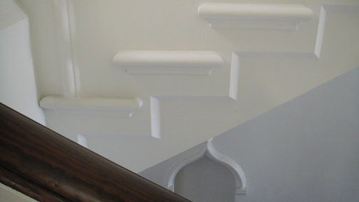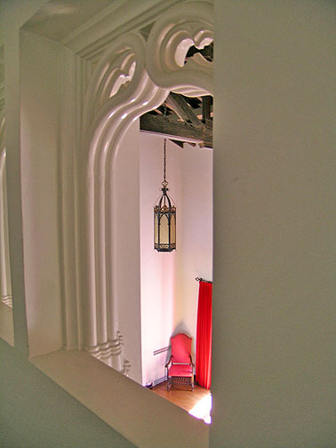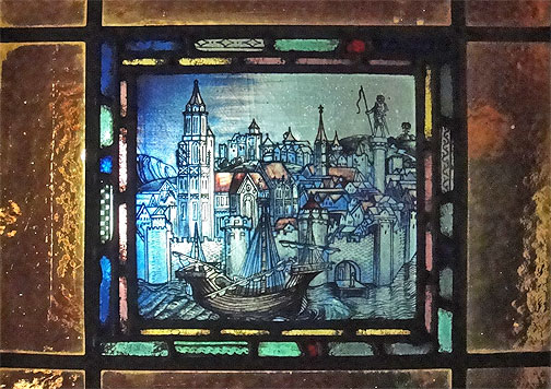 Stairwell window incorporating John Henry Nash’s initials and the Greek word “hesperothen” (from the west)