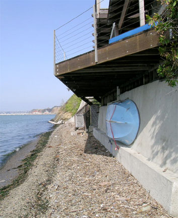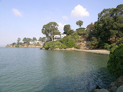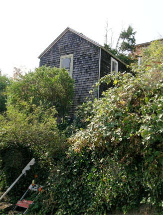 While many of the newer bay-view homes are overscaled, this house makes a statement of modesty. Note the sign in the window: Imagine peace.