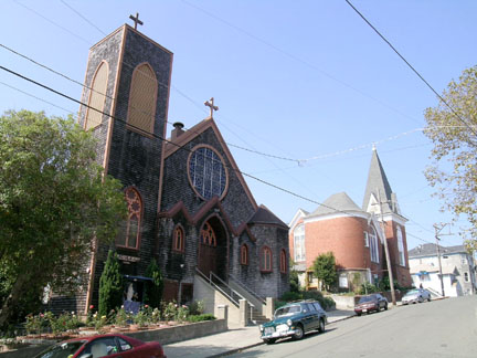 From the left: Our Lady of Mercy Catholic Church (1903) and the First United Methodist Church (1907)
