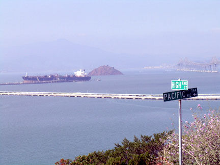 A Chevron tanker, Red Rock, the Richmond-San Rafael Bridge, and, in the hazy distance, Mount Tamalpais and San Quentin.