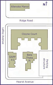 The Goldman School of Public Policy (bottom right-hand corner) from the air in 1994, before the new addition was built in front of it. Cloyne Court is to the immediate left, and Allanoke is at the bottom left-hand corner. The large white square at center left is the Jesuit School of Theologys Chardin Hall, home of the Beta Theta Pi chapter during the 1960s. At the top right-hand corner with tennis courts on the roof is the upper Hearst parking structure, former site of College Hall. The parking lot to its left is the former home of Newman Hall.. The two structures at top left are 19th century residences. Click the photo for an aerial view of Daleys Scenic Park.