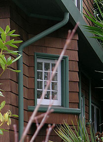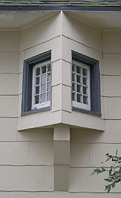 A rather mixed result was achieved in a recent renovation at 2818 San Pablo Avenue (see photos below). The house was converted into a duplex, and the attic dormers suffered unsightly modifications. The ground floor retains most of its diamond-inset windows (see detail in Part 1); however, all but one of the upper-story windows present a discordant note.